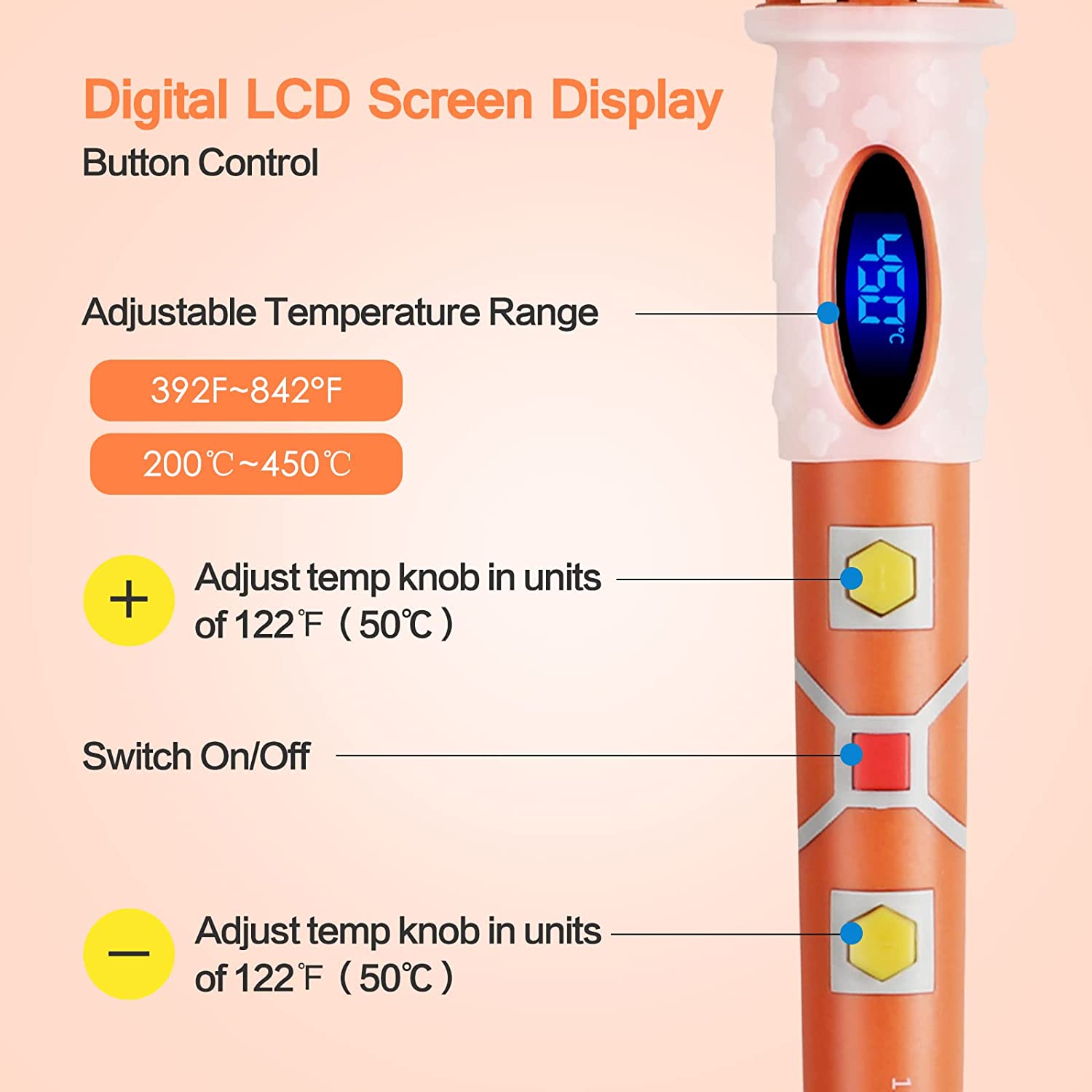 The inner-heated ceramic technology of the electric soldering iron, which is comprised of stainless steel with an iron-plated tip, allows for speedy heating and high-temperature stability. You can more clearly understand the temperature when using a soldering iron with a high definition LCD screen display. Range of temperature adjustment: 200–450°C (392–842°F). The soldering iron has separate power switch and temperature control buttons, making it simple and cost-free to turn on/off or change the temperature as needed.